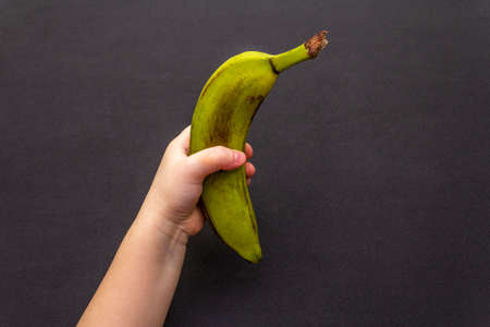 One ripe yellow-green banana in children's hand. Black background, top view, close up.