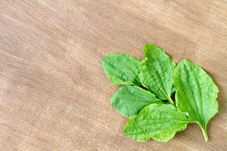 Plantain leaves on a wooden background.