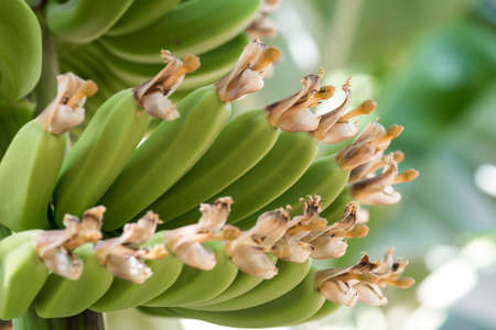 Unripe bananas on the tree in Punta Cana, La Altagracia, Dominican Republic. Close-up