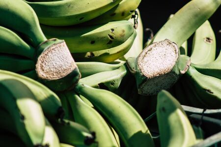 Green Bananas Bunches on Fruit Stand in Tropical Country