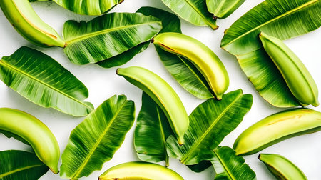 Green bananas and leaves arranged on white background. Overhead shot. Food, healthy eating, tropical fruit concept. Ideal for culinary, lifestyle, or advertising.