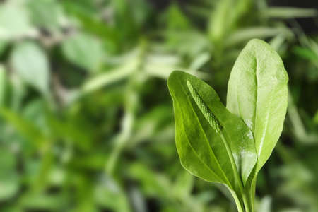 Green broadleaf plantain leaves outdoors, space for text. Medicinal herb