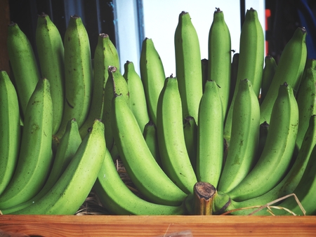 Plantain or Green Banana (Musa x paradisiaca) on white wooden background