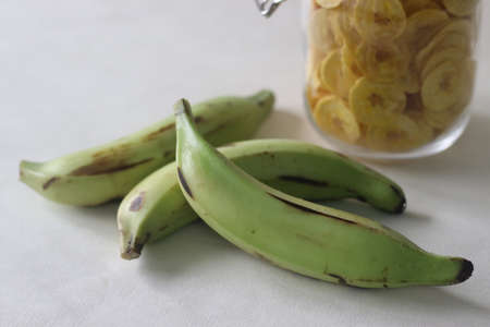 Under ripe plantain used for making banana chips. A main item of vegetarian Onam meals popularly called ethakka upperi. Shot on white background