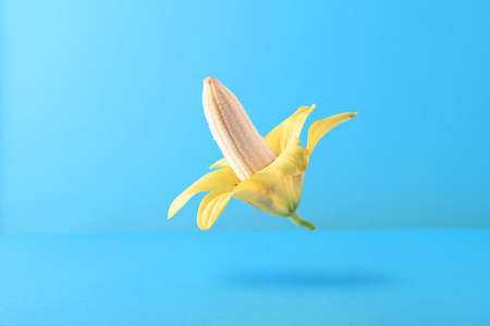 Creative photo of a peeled banana on a blue background.