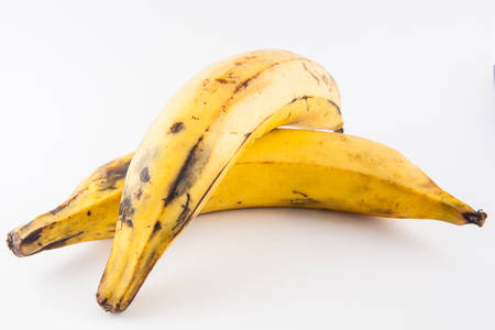 The two bananas with some black marks isolated on the white background