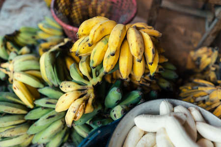 Plenty of fresh banana fruits on a counter in a market in a store or supermarket. Farm products. Vitamins and healthy foods. Fruits and vegetables in Asia.