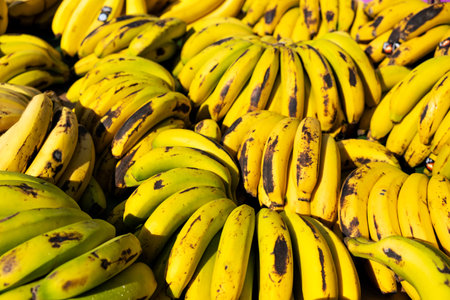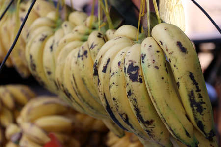 Ripe yellow bananas on the market close-up.
