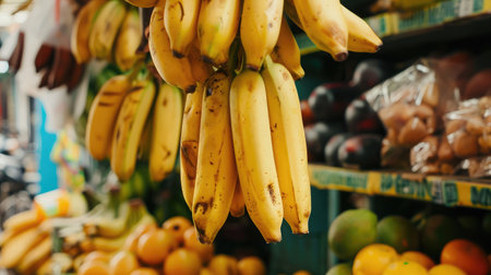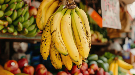 A bunch of bananas hanging in a traditional market stall, surrounded by other fresh produce.