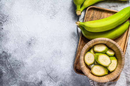 Sliced green banana in a wooden bowl. Gray background. Top view. Space for text. Tropical fruit.