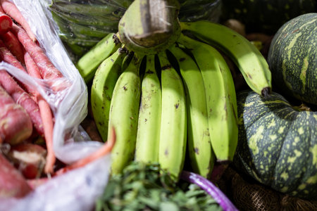 defocus shot of exotic tropical fruit, green banana display at market stall. selective focus shot.image may contain some grain and noise.