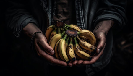 A man hand holding a fresh, ripe banana, a healthy snack generated by artificial intelligence