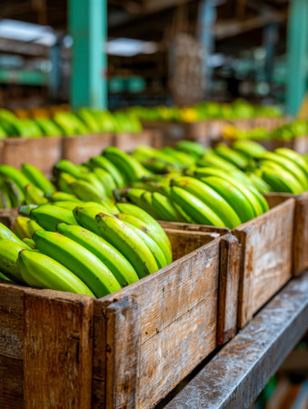 Vibrant green bananas are carefully organized in weathered wooden containers, creating a lively, rustic scene ideal for wholesale markets and bustling distribution c