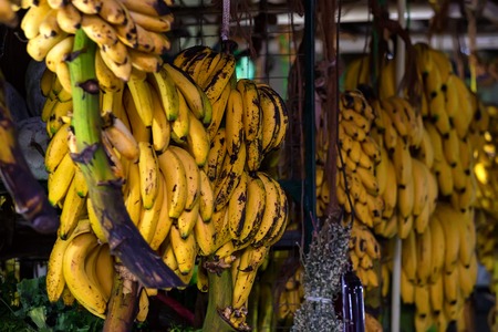 Bunches of yellow bananas on the stand in open-air fruit and vegetable market