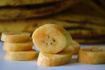 Fried half ripe plantain slices isolated on white background