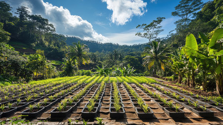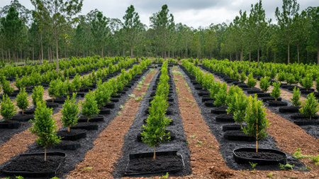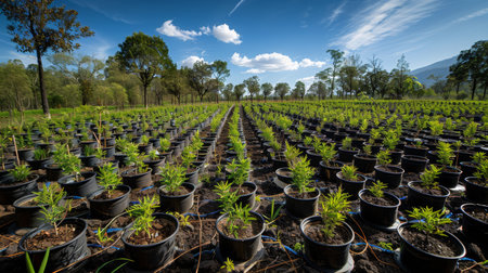 This image captures a vibrant forest nursery with meticulously planted young trees in neat rows, showcasing a healthy environment and sustainable agricultural practices.