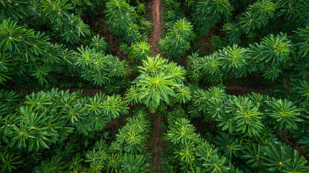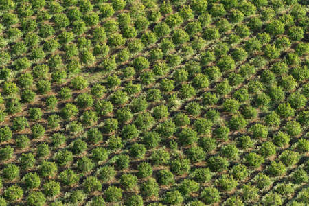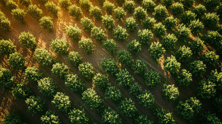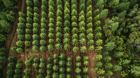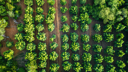 This aerial photograph captures a stunning view of lush green trees arranged in symmetrical patterns. The vibrant foliage showcases nature's beauty.