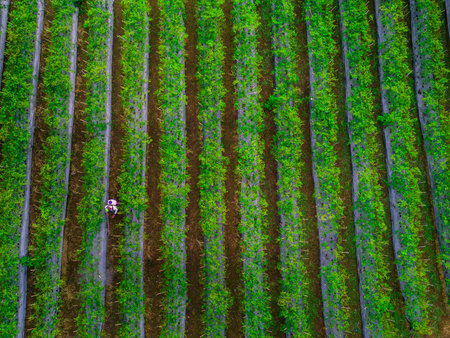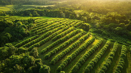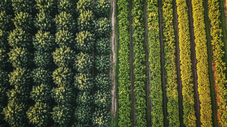 This aerial photograph showcases vibrant green rows of diverse crops, emphasizing the beauty of agricultural landscapes and the harmony of nature.