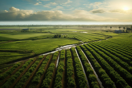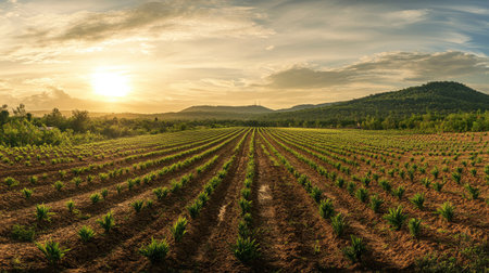 A tranquil dawn scene unfolds across a serene agricultural landscape Misty mountains rise in the distance, while irrigation systems gently water lush crops The peaceful atmosphere is enhanced by the soft morning light, creating a harmonious blend of nature's beauty and human industry AI Generative