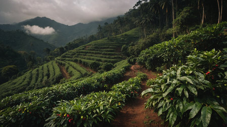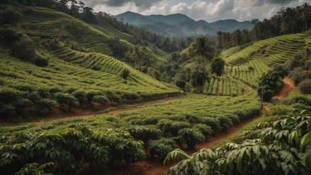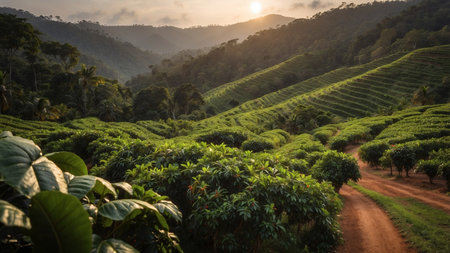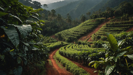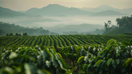 Softly blurred rows of coffee plants stretch into the distance fading into a hazy backdrop of rolling hills and misty mountain peaks.