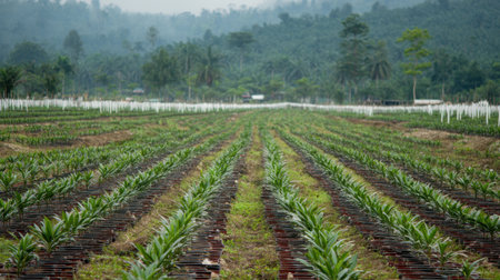 A wide view of a thriving pineapple plantation, featuring neatly organized rows of green leaves under a foggy sky, exemplifying sustainable agricultural methods in a serene tropical landscape.
