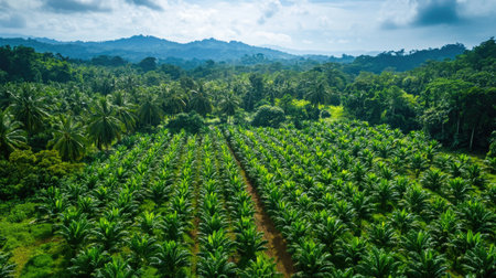 Aerial view of a vibrant palm tree plantation surrounded by lush greenery, showcasing the beauty of tropical agriculture under a bright blue sky.
