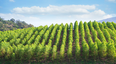 A breathtaking view of a green forest landscape showcasing rows of young trees, embraced by majestic mountains and a bright, serene sky filled with clouds.