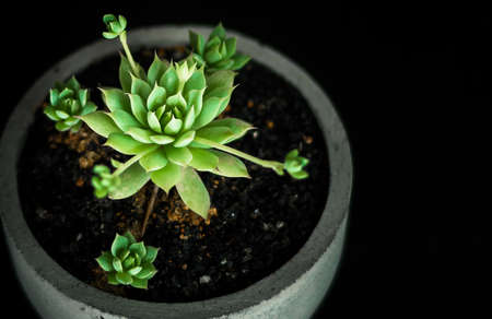 Top view of green succulent plants in concrete pot with copy space