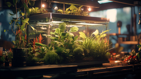 beautiful living room with aquarium and floating plants, creating natural habitat, created with generative ai