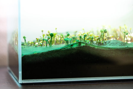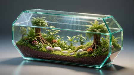 open terrarium with layers of soil, pebbles, and plants, created with generative ai