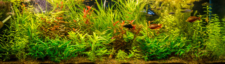 Underwater landscape nature style closeup aquarium tank with a variety of aquatic plants inside.Fresh water with hobby tropical fish