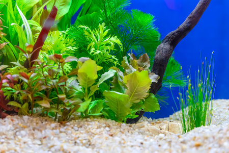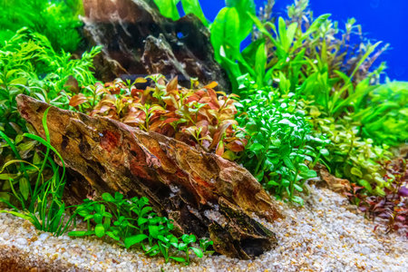 Underwater landscape nature style closeup aquarium tank with a variety of aquatic plants and driftwood inside.