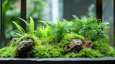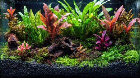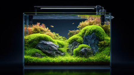 An aquarium showcases a vibrant underwater landscape. Lush green plants and moss cover the rocks within the glass tank. The scene is illuminated by a top-mounted light, against a dark background, highlighting the underwater scene. Suitable for illustrating biodiversity or ornamental applications.