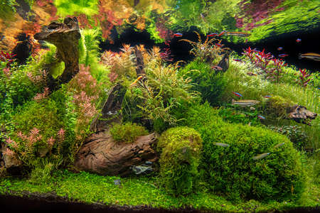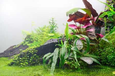 Underwater landscape nature forest style aquarium tank with a variety of aquatic plants, stones and herb decorations.