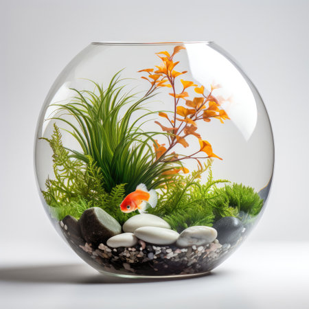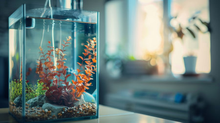 A contemporary fish tank with a minimalist touch adorned with only a few delicate plant decorations