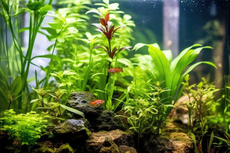 macro view of green plants in aquarium with colorful fish, created with generative ai
