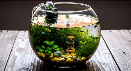 A beautifully designed freshwater aquarium brings a sense of calm and tranquility to any space. The meticulously raked white sand mimics a Japanese zen garden, creating a peaceful underwater landscape where small, vibrant fish swim among rocks and lush green plants. This miniature ecosystem is a perfect representation of balance and natural harmony, offering a quiet escape from the everyday.