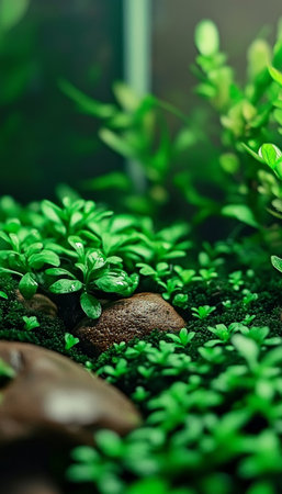 Lush Green Aquarium Plants Thriving on Rocks and Substrate in a Serene Aquatic Ecosystem