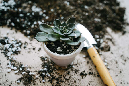Transplanting a plant in white pot. Spatula with soil for a houseplant.