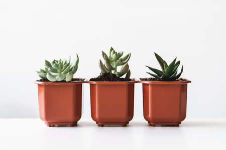 Group of succulent plants in small brown plastic pots indoors