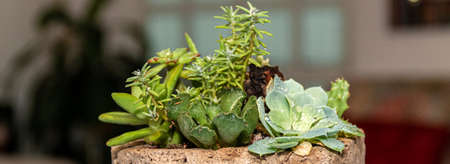 Succulents on the windowsill in the apartment, house cleanliness concept