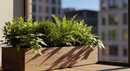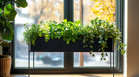 A vibrant indoor garden showcases lush plants in a stylish planter by a sunny window.
