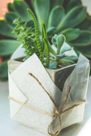 A box of succulents on the windowsill as decoration