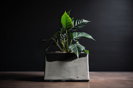 minimalist concrete pot with pop of green and bold black foliage, created with generative ai