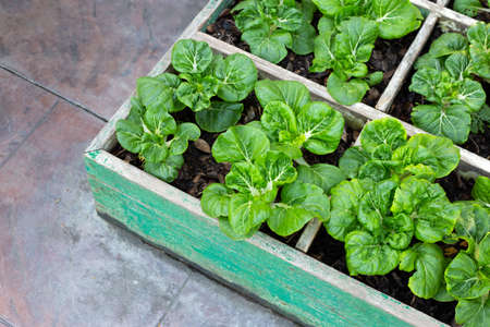 Green plants in wooden boxes. Gardening concept. Selective focus.