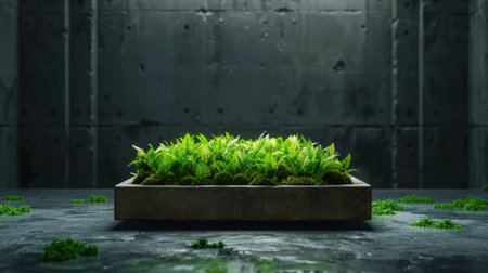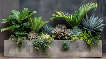Vibrant display of lush green ferns modern concrete planter, set against textured industrial backdrop. scene evokes sense of tranquility and connection to nature, highlighting beauty of greenery