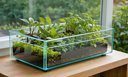 A small, enclosed garden sits on a wooden table near a window