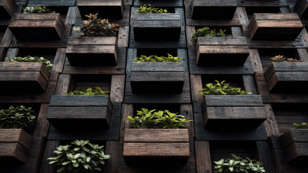 Vertical wall with a repeating pattern of wooden boxes, each containing greenery. The boxes are various shades of dark brown and gray wood.