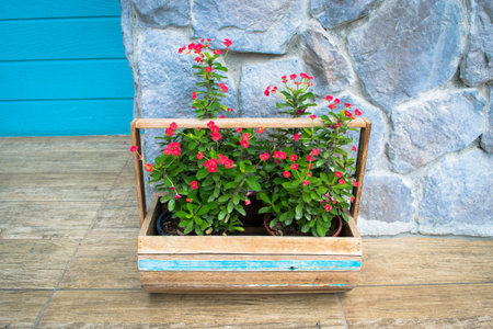 Bright garden flowers in wooden rectangular boxes
