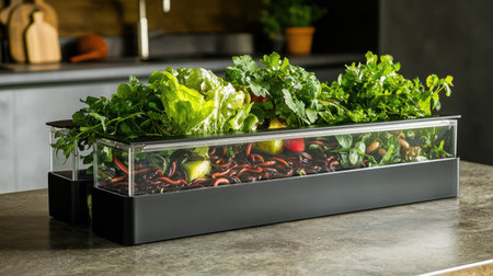 A modern indoor hydroponic garden featuring fresh vegetables and herbs, ideal for urban living and sustainable home decor. Perfect for health enthusiasts.